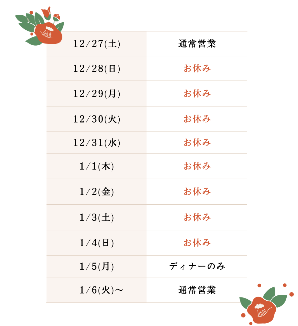 休業期間:2025年12月28日(日)〜 2026年1月4日(日)
